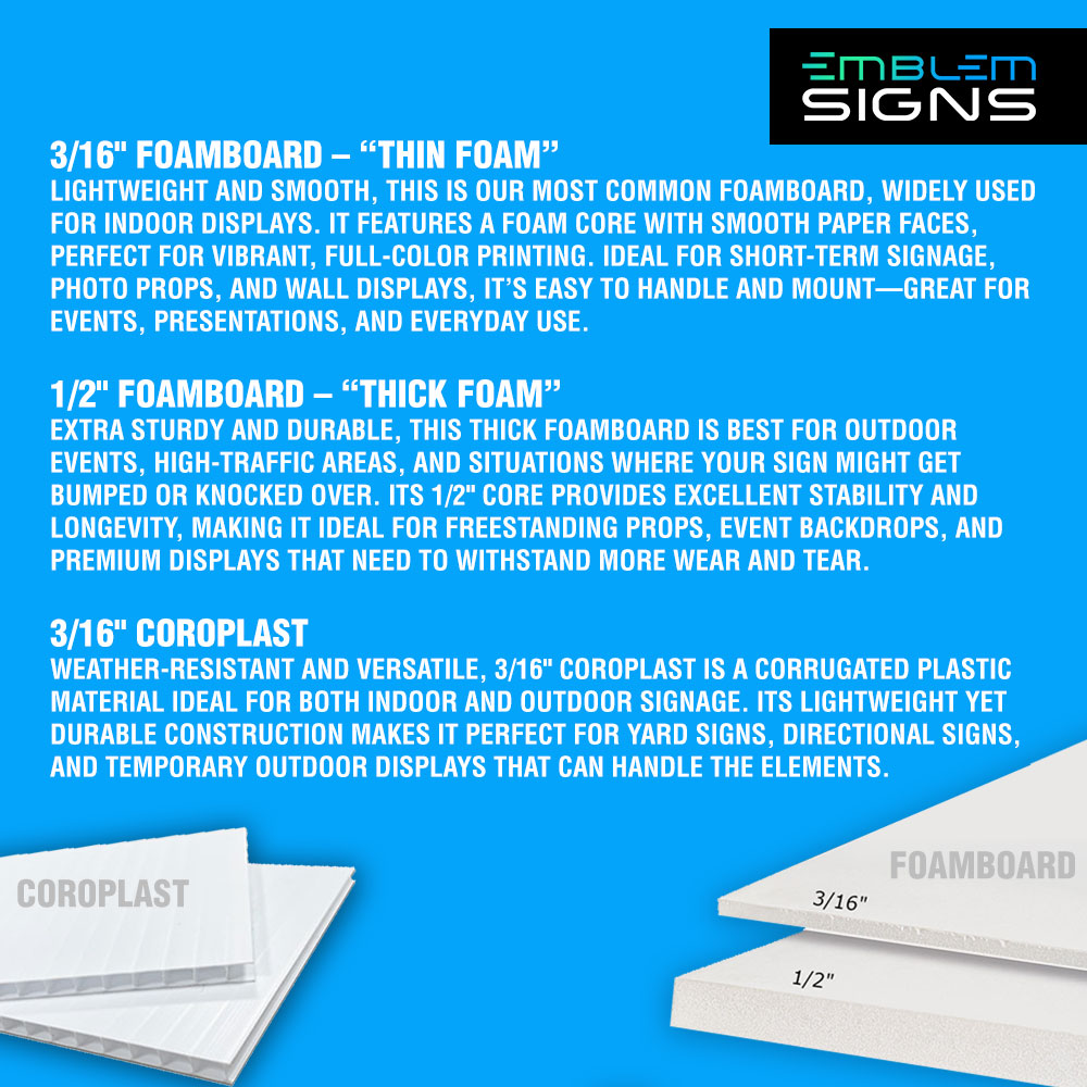Size Thin Foam Thick Foam Coroplast 4×4 $65.00 $90.00 $55.00 4×5 $75.00 $110.00 $65.00 4×6 $80.00 $130.00 $75.00 4×7 $85.00 $140.00 $80.00 4×8 $90.00 $150.00 $85.00